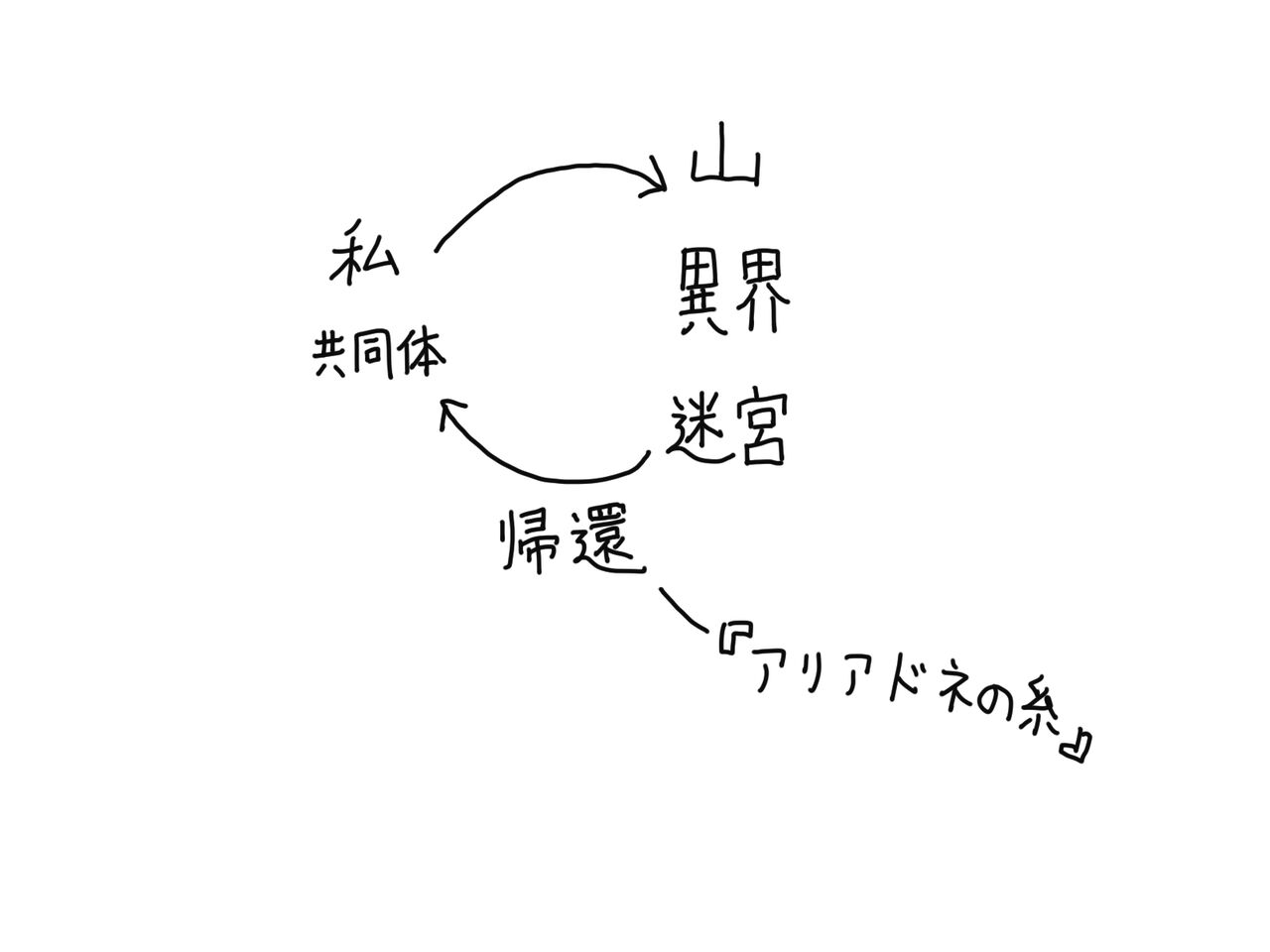 けっこう引き合いに出している、神話学者のジョーゼフ・キャンベルによれば、ざっくりとは、「アリアドネの糸」が見えていれば、「迷宮」の奥で怪物を殺すことになるのではなく、自分を殺すことになる、とされています。